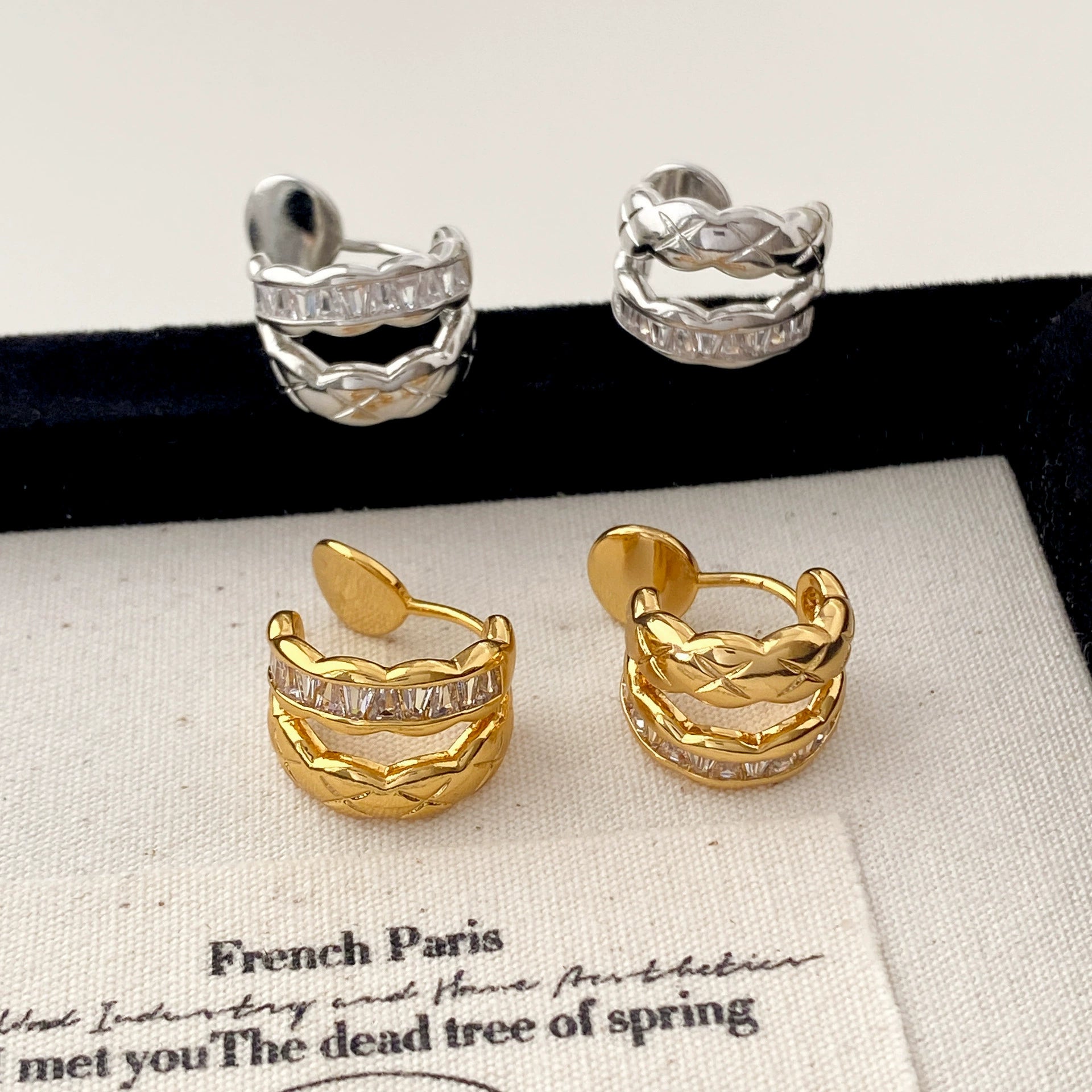 Drape your ears in quiet luxury with our Braided Baguette Clip-On Earrings in Gold. Designed for non-pierced ears, these elegant earrings feature a woven-style copper band, gold finish for a warm luster, and adorned with shimmering cubic zirconia baguettes. Compact at 15mm high and only 3g per piece, they’re lightweight, secure, and perfect for elevating everyday or evening looks. A must-have for anyone seeking clip on earrings that balance timeless beauty and comfort.
