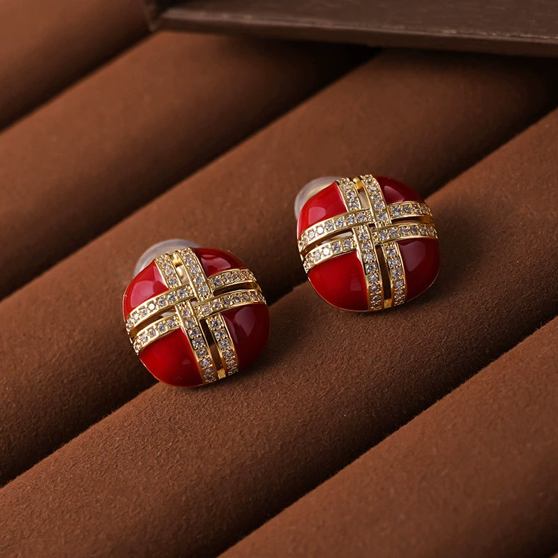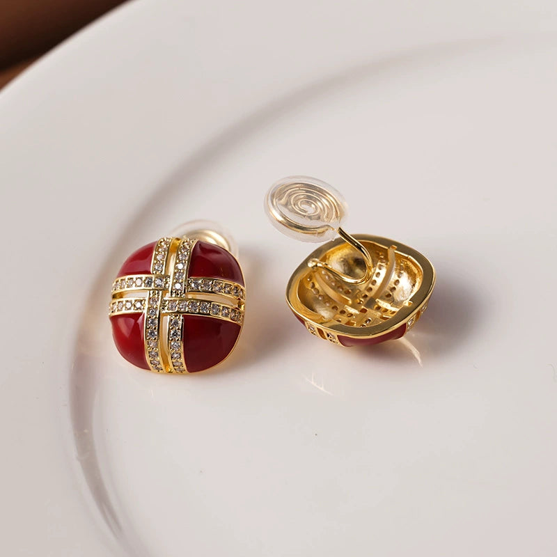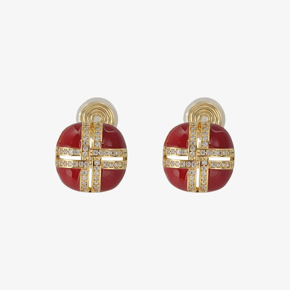 Add a bold touch of luxury to your accessory collection with the Crimson Enamel & Gold Cross Clip-On Earrings. These clip on earrings for women feature a rich crimson enamel surface adorned with a gold cross design encrusted with dazzling cubic zirconia. Crafted from durable copper with radiant gold finish, these clip on stud earrings are lightweight yet striking, making them perfect for non-pierced ears. The vibrant color and intricate design make these earrings an ideal choice for elevating any outfit, whether casual or formal.