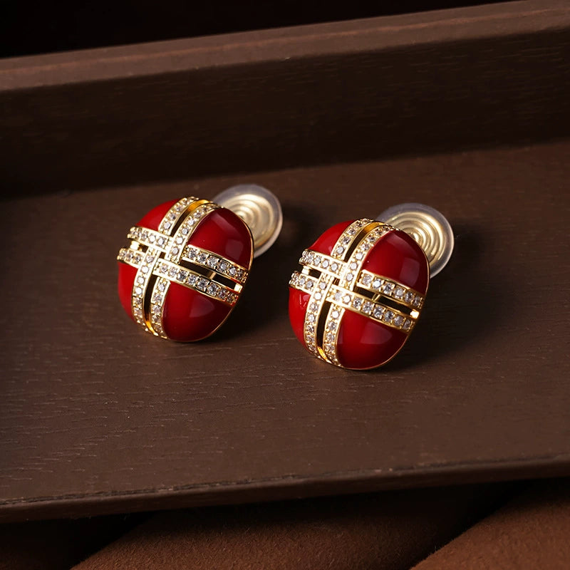 Crimson Enamel & Gold Cross Clip-On Earrings