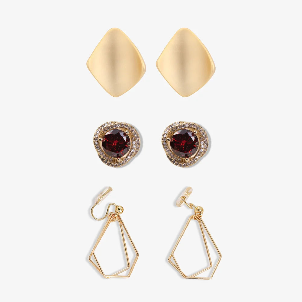 - Set van drie clip-on oorbellen: Bevat opvallende geometrische ontwerpen en een opvallend paar robijnrode zirkonia's.