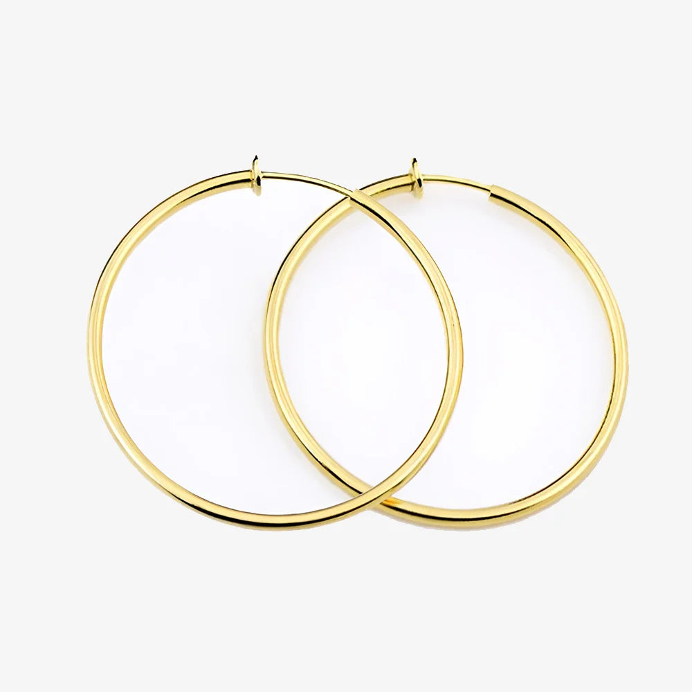 Maak een gedurfd statement met de Grote Creolen Clip-On Oorbellen in Goud, verkrijgbaar in de maten 20 mm, 40 mm en 60 mm. Deze creolen, gemaakt van goud gegalvaniseerd koper, combineren tijdloze elegantie met het gemak van een schuif-veer clip-on mechanisme, wat zorgt voor een veilige en comfortabele pasvorm voor oren zonder gaatjes. Perfect voor zowel mannen als vrouwen, deze oorbellen tillen elke look naar een hoger niveau, van casual outfits tot formele kleding. Of je nu de voorkeur geeft aan een subtiele touch met de 20 mm maat of een dramatische impact met de 60 mm, deze veelzijdige creolen zijn een essentieel accessoire voor elke gelegenheid.