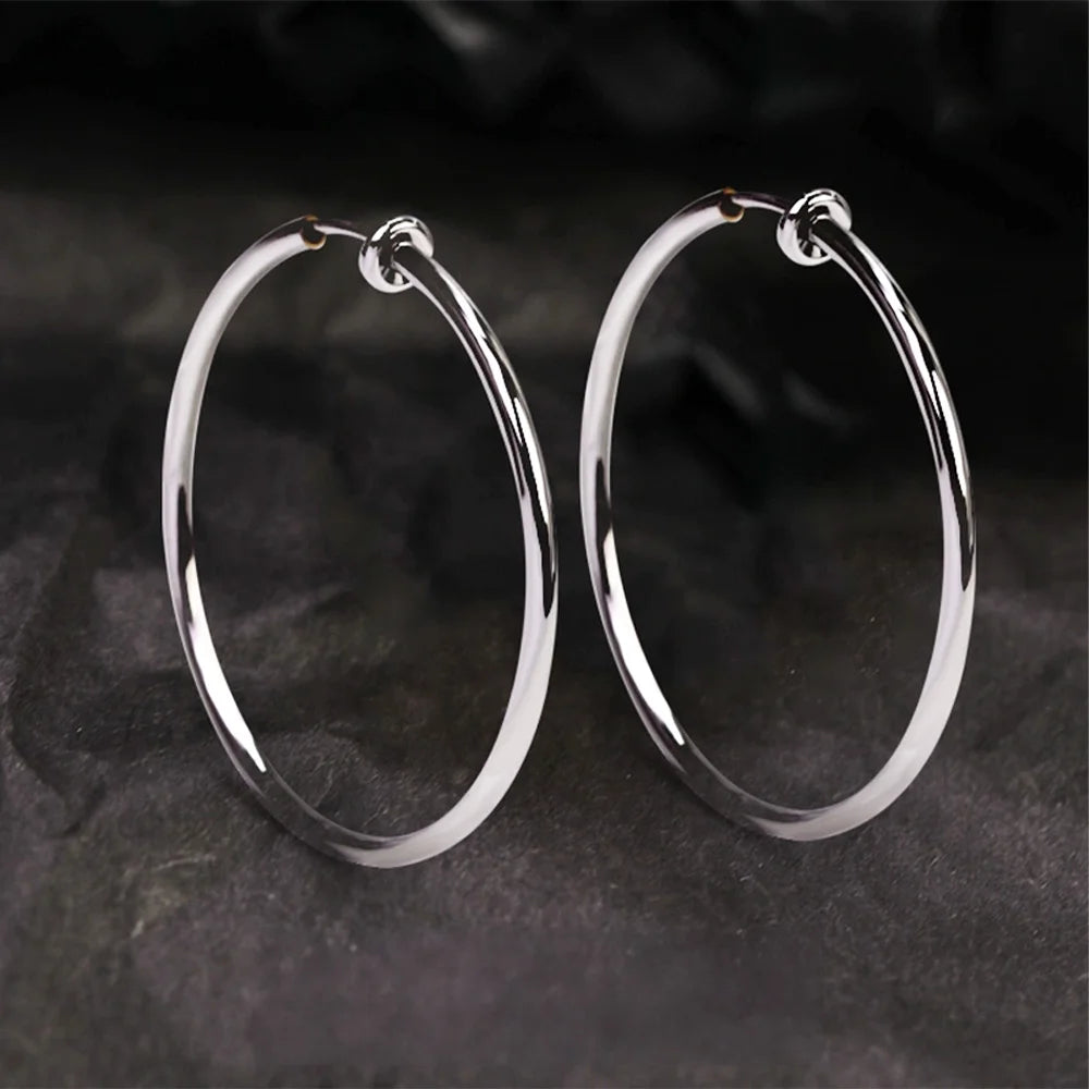 Elevate your style with the Large Hoop Clip-On Earrings in Silver. Crafted from silver electroplated copper, these hoop earrings feature a sleek and timeless design paired with a sliding spring clip-on mechanism for a secure and comfortable fit, perfect for non-pierced ears. Whether for everyday wear or special occasions, these versatile hoops add elegance and sophistication to any outfit. Ideal for both men and women, they make a bold statement with their effortless charm.