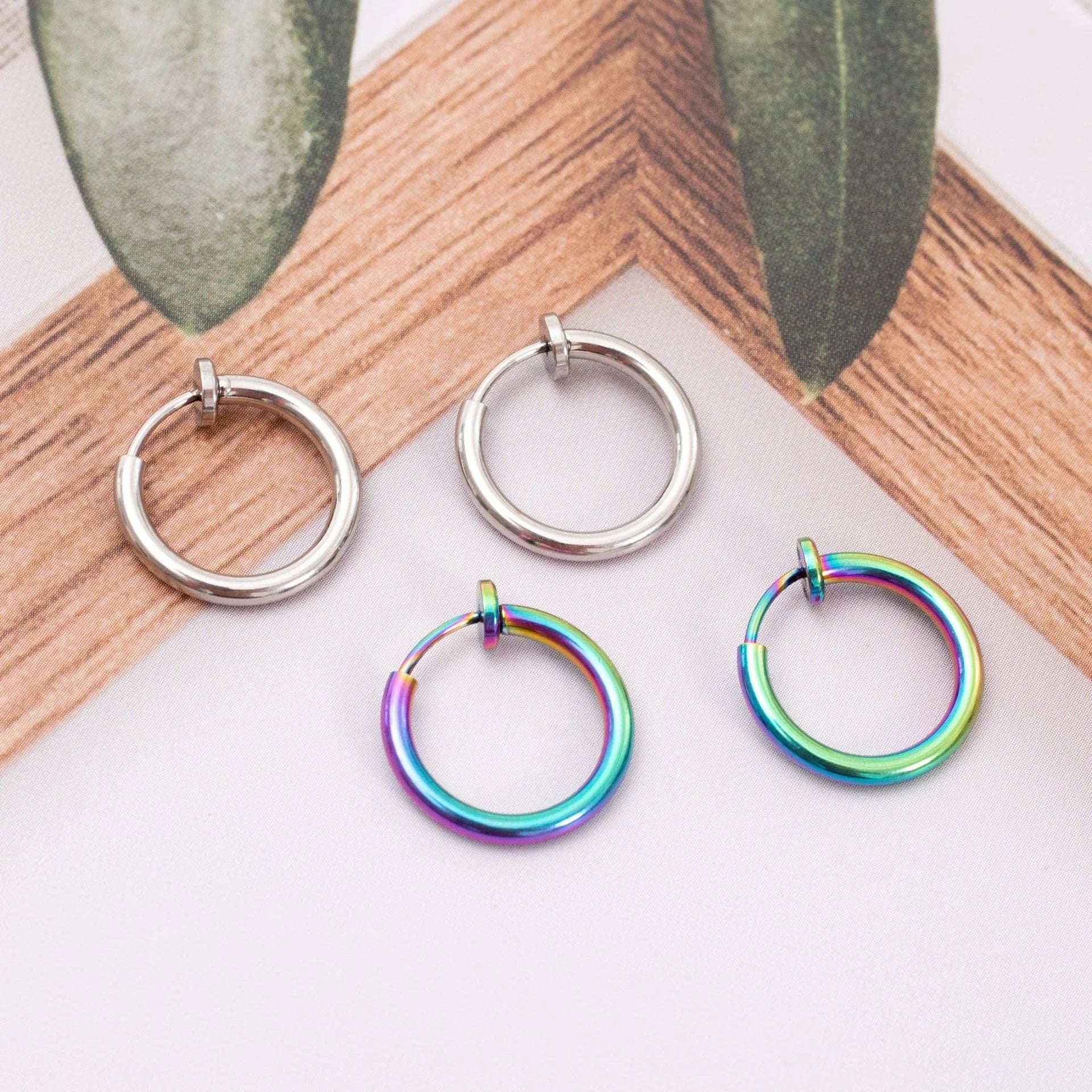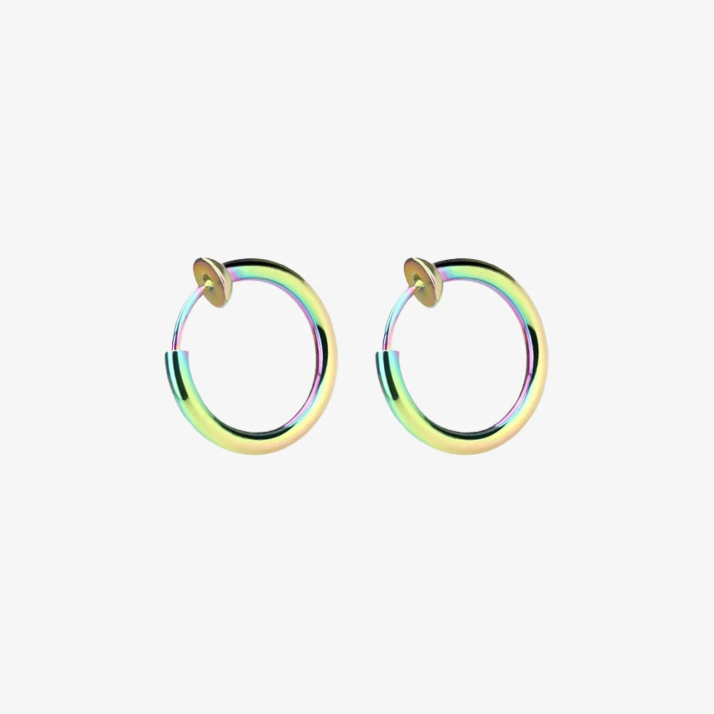 These iridescent mini hoop earrings are the ideal accessory for adding a pop of color to your jewelry collection. Whether you're attending a festival or simply want to express your vibrant personality, these clip-on hoop earrings are sure to turn heads. Perfect for those who love to mix style with fun.